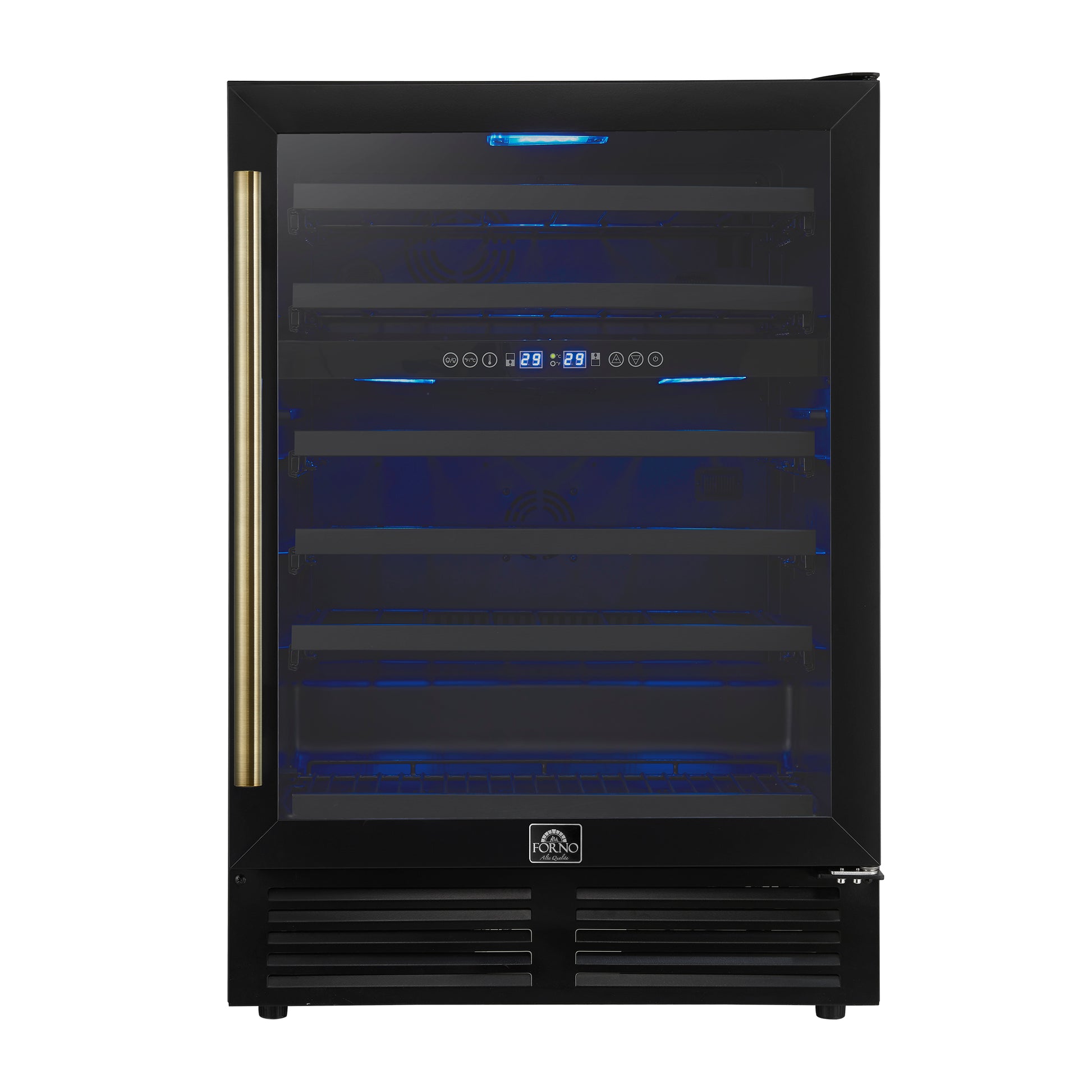 Forno Bacchino 24 Inch Wine Cooler, Black with Antique Brass Handles, with LED Lighting, Triple Glass Door, 51 Bottle Capacity, Built-In or Freestanding